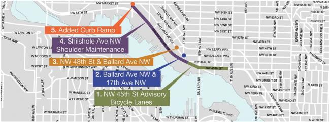 Work on the remaining two safety elements, installing an ADA-compliant curb ramp at 24th Avenue NW and repairing the roadway shoulder along Shilshole Avenue NW, has not yet been scheduled.