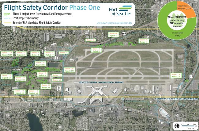 The Port of Seattle is set to cut down 2,800 identified trees in SeaTac, Burien and Des Moines. This plan, dubbed the "Flight Corridor Safety Program" is to ensure that planes can take off and land in a way that "safeguards the people at the airport and in the surrounding community", according to the Port. It is also intended to comply with Federal Aviation Administration (FAA) regulations and state code. The trees will be removed over the course of three years. In phase one, which begins in late 2016, approximately 1,170 trees on Port property will be removed. Alongside the cutting, approximately 4,000 trees will be planted to compensate for the trees lost.