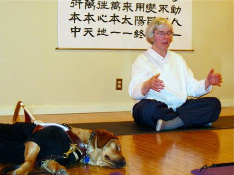 Her students are unwaveringly attentive -- except for Harley who frequently naps. However, when he is needed, he jumps to his feet -- all four of them. Harley is a guide dog and also a regular attendee of the yoga class for the blind and visually impaired that Taschler founded in January.