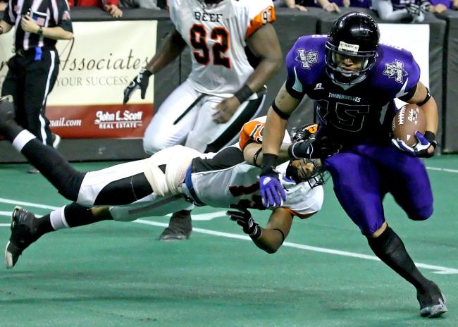 Omaha Beef quarterback James McNear veers to his right and cuts toward the end zone, looking for an opening to a two-point conversion that would tie his team with the Seattle Timberwolves at 52-52 with only 23 seconds to play.