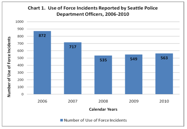 • Seattle Police Department Officers use force infrequently. Only 0.12% of all interactions between officers and community members in 2010 resulted in use of force by officers, about the same as in 2009 and 2008, and down from the levels in 2007 and 2006.