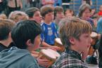 Schmitz Park music teacher Liz Dunn led 30 elementary school kids in a drum circle to warm up the crowd as the rest of the kids and teachers poured into the gymnasium to be “briefed” by principal Gerrit Kischner about the international program.