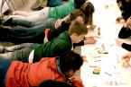 Marquese Bell of Aimee Backlund's 7th grade US History class at Denny Middle School creates a sketch on a long scroll to be sent to Tanzanian children who will, in turn, reply to Ms. Backlund's class with a scroll of their own, through The Mural Project.
