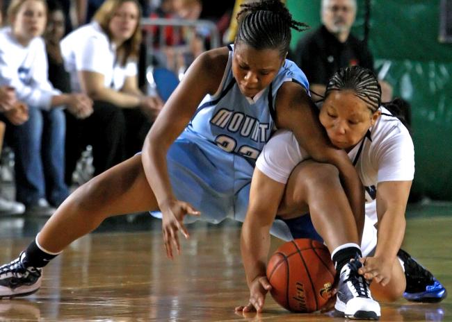 SLIDESHOW: CLICK ON THE PHOTOS TO PLAY SLIDESHOW. Mt. Rainier's Kiana Gandy (left) and Federal Ways Brittany Barrington wrestle for a loose ball.