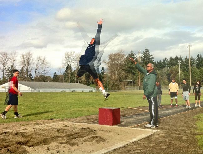 Coach Tyrone Curry (in the green jacket) watches as members of the Evergreen High School track team go through a jumping drill in preparation for an upcoming meet. Coach Curry is also the school janitor at Evergreen, works two additional jobs and is a millionaire. He won the lottery in 2006 and now plans to refurbish the aging track at Evergreen with his own money. PLEASE CLICK THE PHOTO ABOVE FOR MORE. Additional photos by Tim Robinson.
