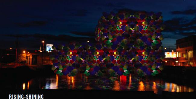 Titled Rising Shining, the art installation replaces the grey of concrete with color, light and air. The proposed design is made of helium balloons that are caught in a net to create floating cubes. Anchored to the ground, the cubes will make up an abstract building. Each cube would hold battery-powered LEDS which produce low-temperature, low-energy, highoutput light so the structure would glow at night.