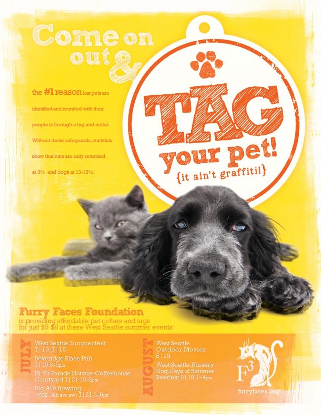 ‘These are frightening, and often heartbreaking numbers for people that have pets’, says Teri Ensley of Furry Faces Foundation, (F3), ‘and this is where F3 can provide an inexpensive method for people to increase the likelihood of reuniting with their pets! ‘Tag Your Pet…It Ain’t Graffiti’ is our newest pet retention program and we are launching it at the West Seattle Summerfest, July 13th – 15th. It’s simple. It’s affordable. It’s a pet tag made for you on the spot!’