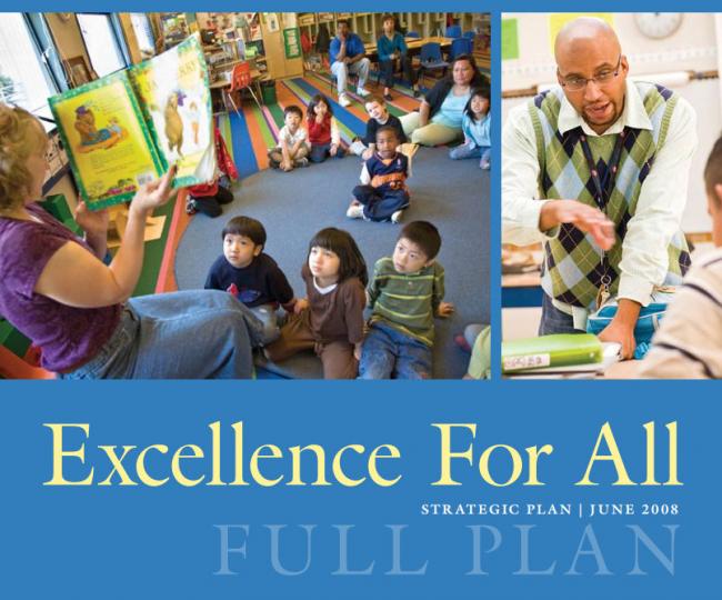 “In 2008, the Seattle School Board unanimously approved Excellence for All, our District’s five-year strategic plan. Excellence for All is aimed at ensuring all students graduate from high school ready for college, careers and life. The plan is based on best practices nationally and input from more than 3,000 staff and community members. The plan includes clear and measurable goals - with strategies to achieve them - for our students, schools, staff and district. Excellence For All is our five-year plan to achieve excellence by: