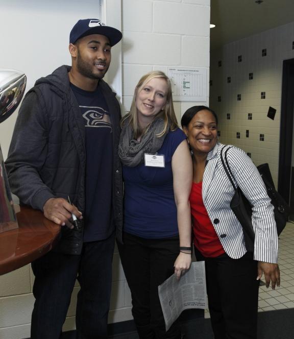 Roxhill Elementary's Robin Hicks (2013 Hero) and Sahnica Washington with K.J. Wright at an event held at CenturyLink Field during which Hicks was honored by Symetra.