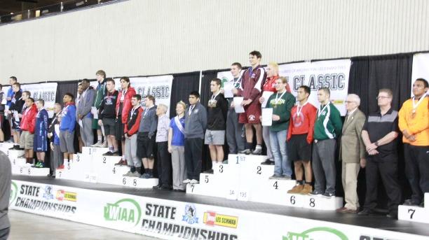 Chief Sealth wrestler, Daron Camacho, stands in the sixth place spot for 3A wrestlers with other classifications on the podium around his 3A group in being given medal awards after action at state at the Tacoma Dome.