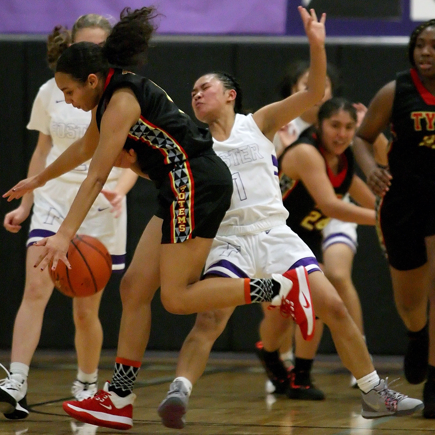 Tida Sesay of Tyee dribbles up court to break Foster's full court pressure.