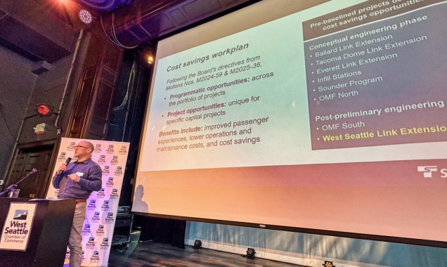 Brad Owen, Sound Transit’s Executive Director for Capital Delivery, addressed the West Seattle Chamber of Commerce on April 8 to outline significant design refinements intended to close a massive funding gap and move the