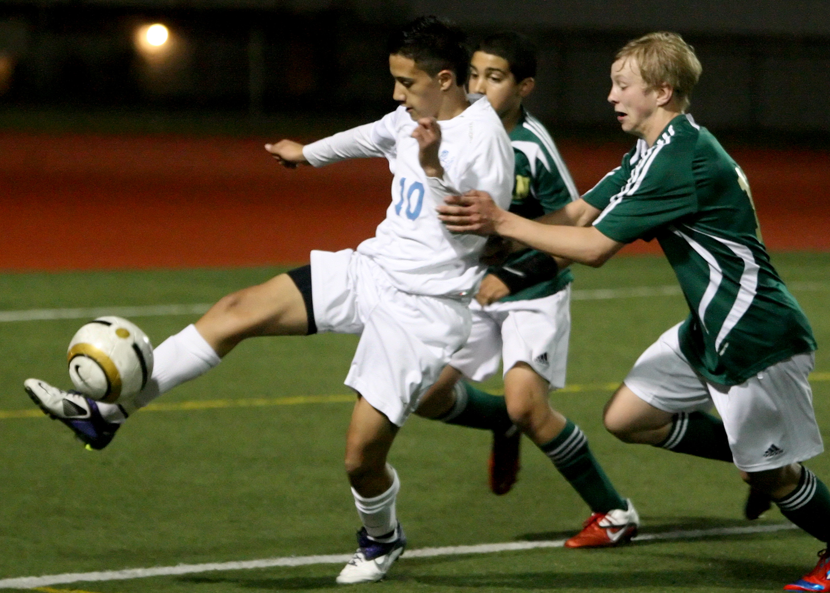 Alex Castillo of Mt Rainier keeps two Auburn players in pursuit. CLICK THE IMAGE ABOVE FOR MORE