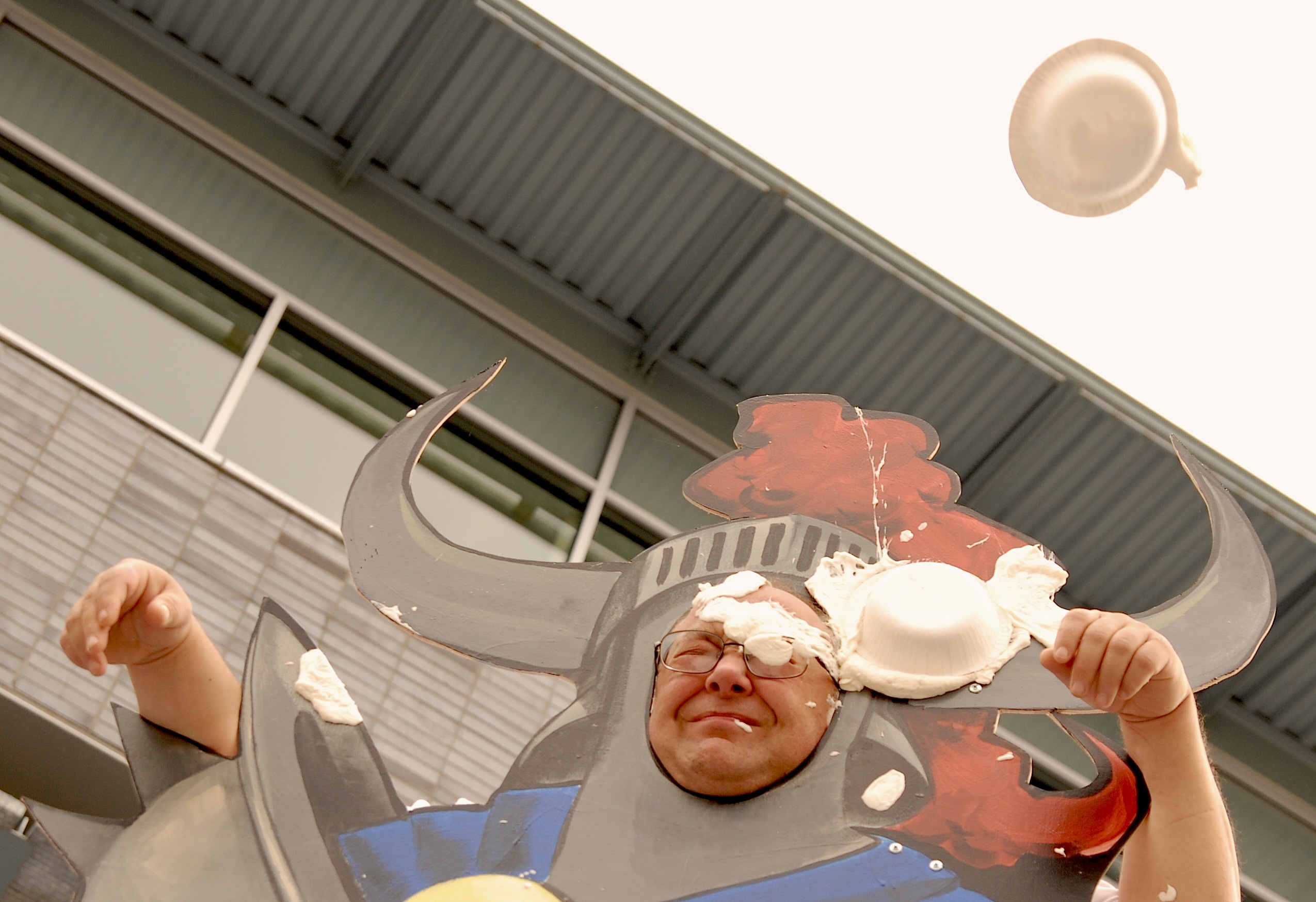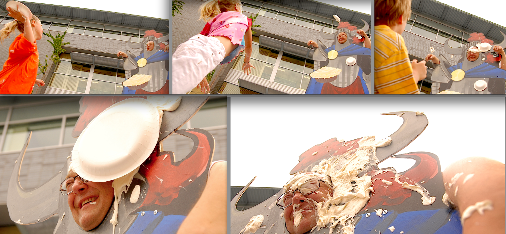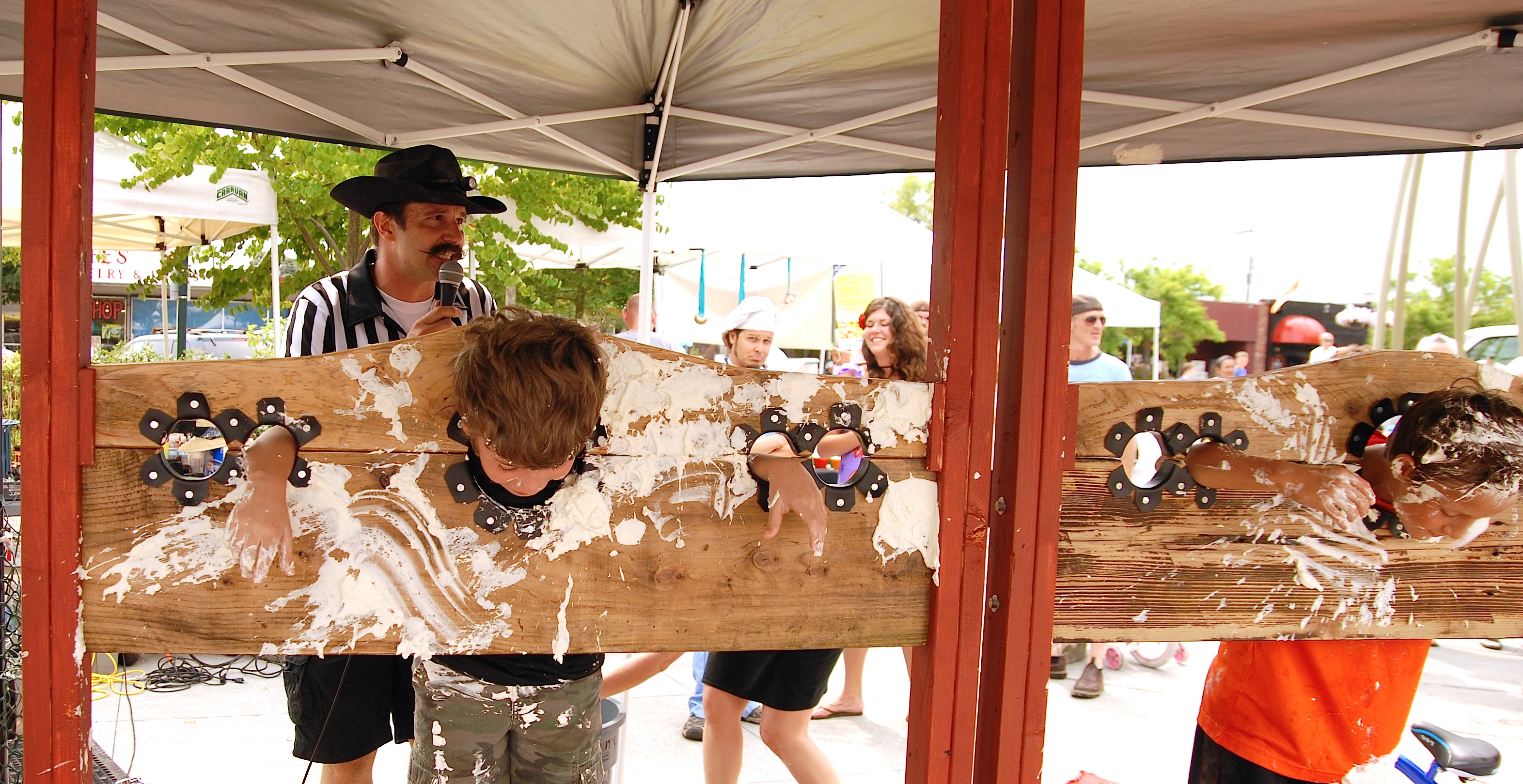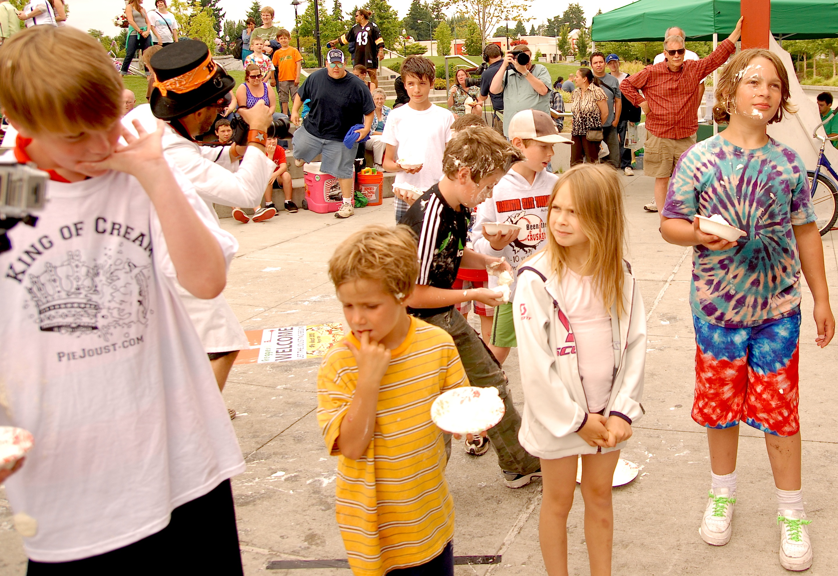 At yesterday's 2nd Annual Pie Joust in Burien's Town Square it was hard to tell the jousters from the jesters as grins were garnished with cream in the circus-like atmosphere. While Brooks Stanfield came in first place and John Lasswell, second, most participants got creamed at one point. Stockades were utilized for punishment when participants were challenged with a spelling bee.