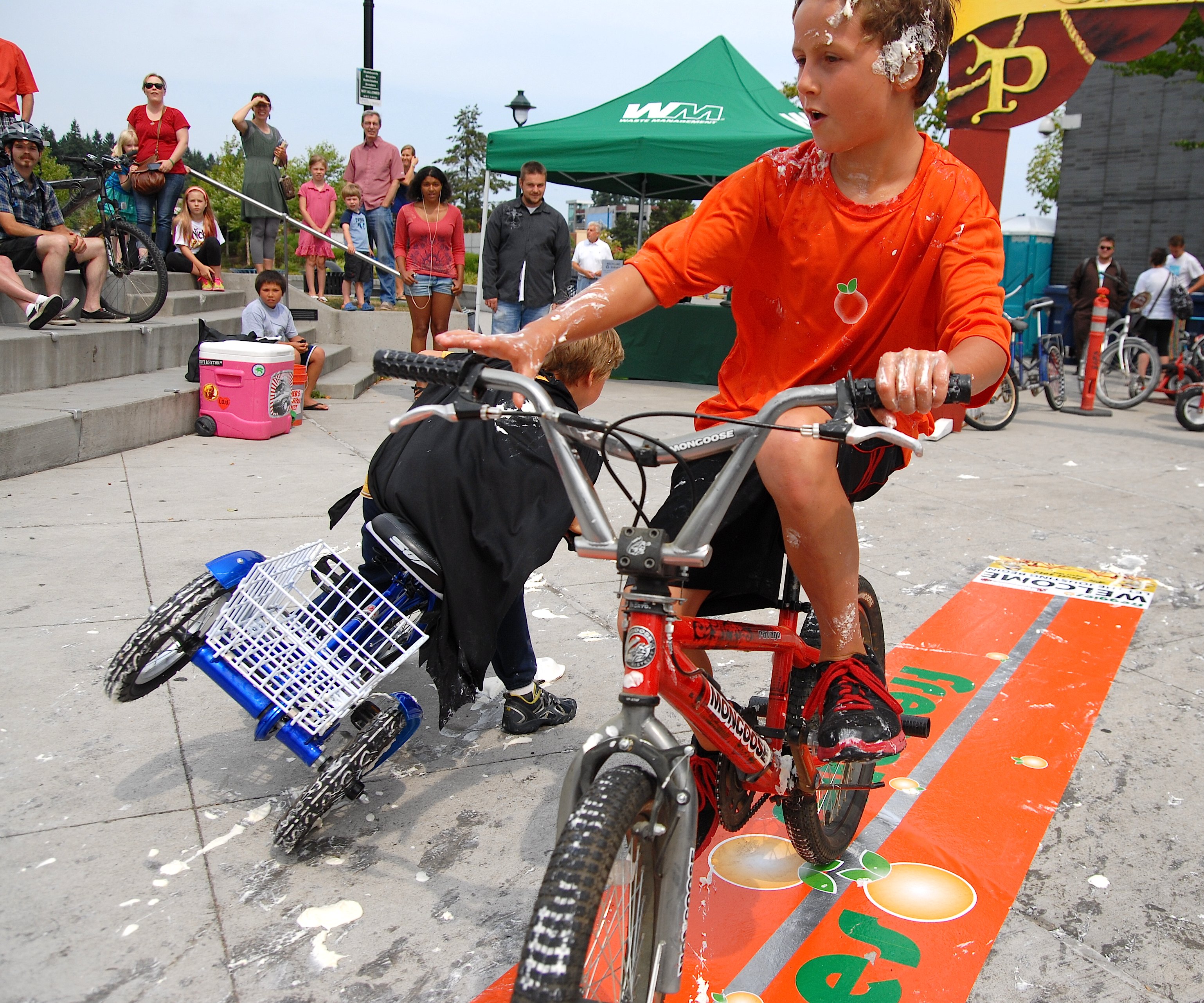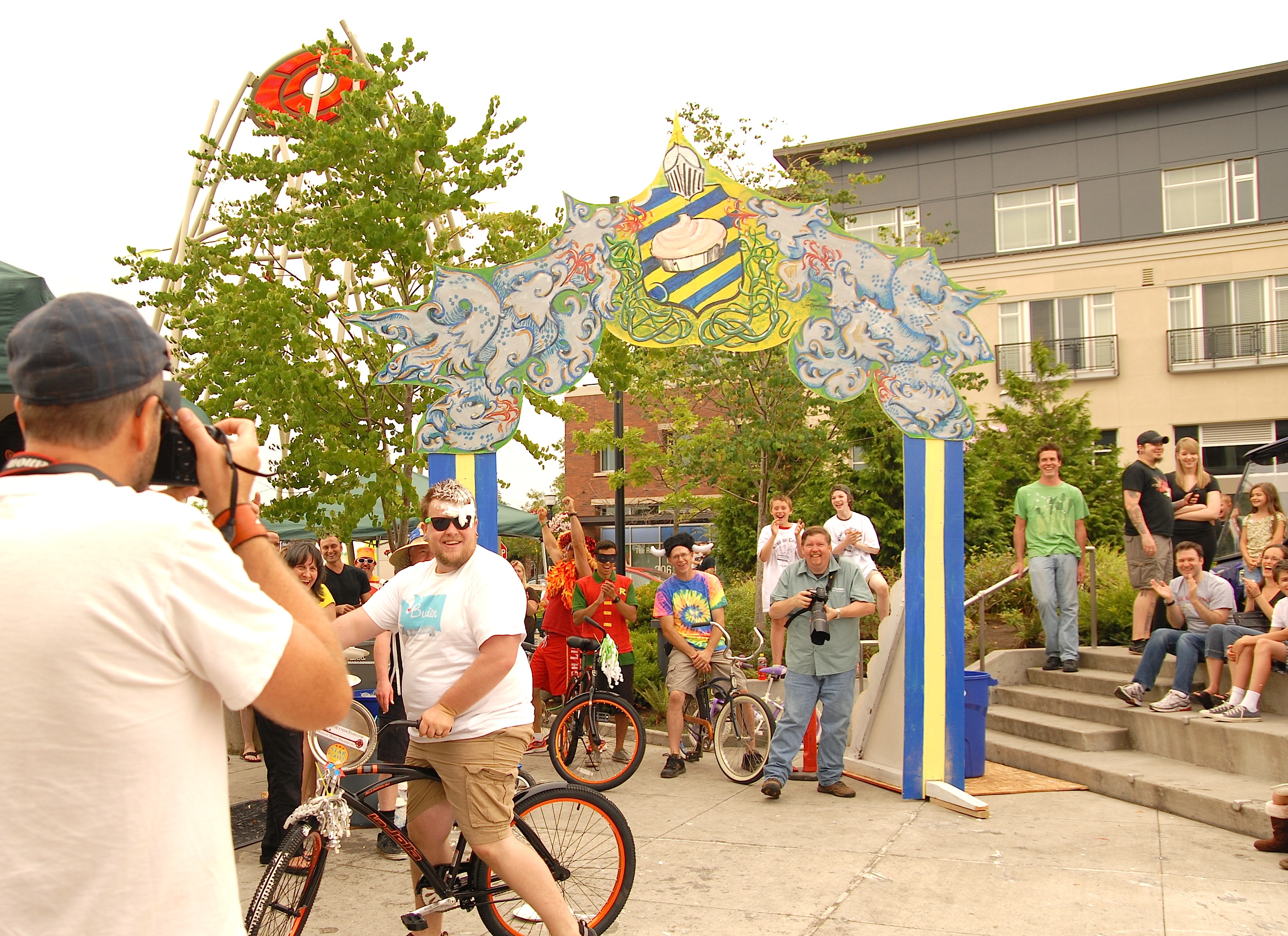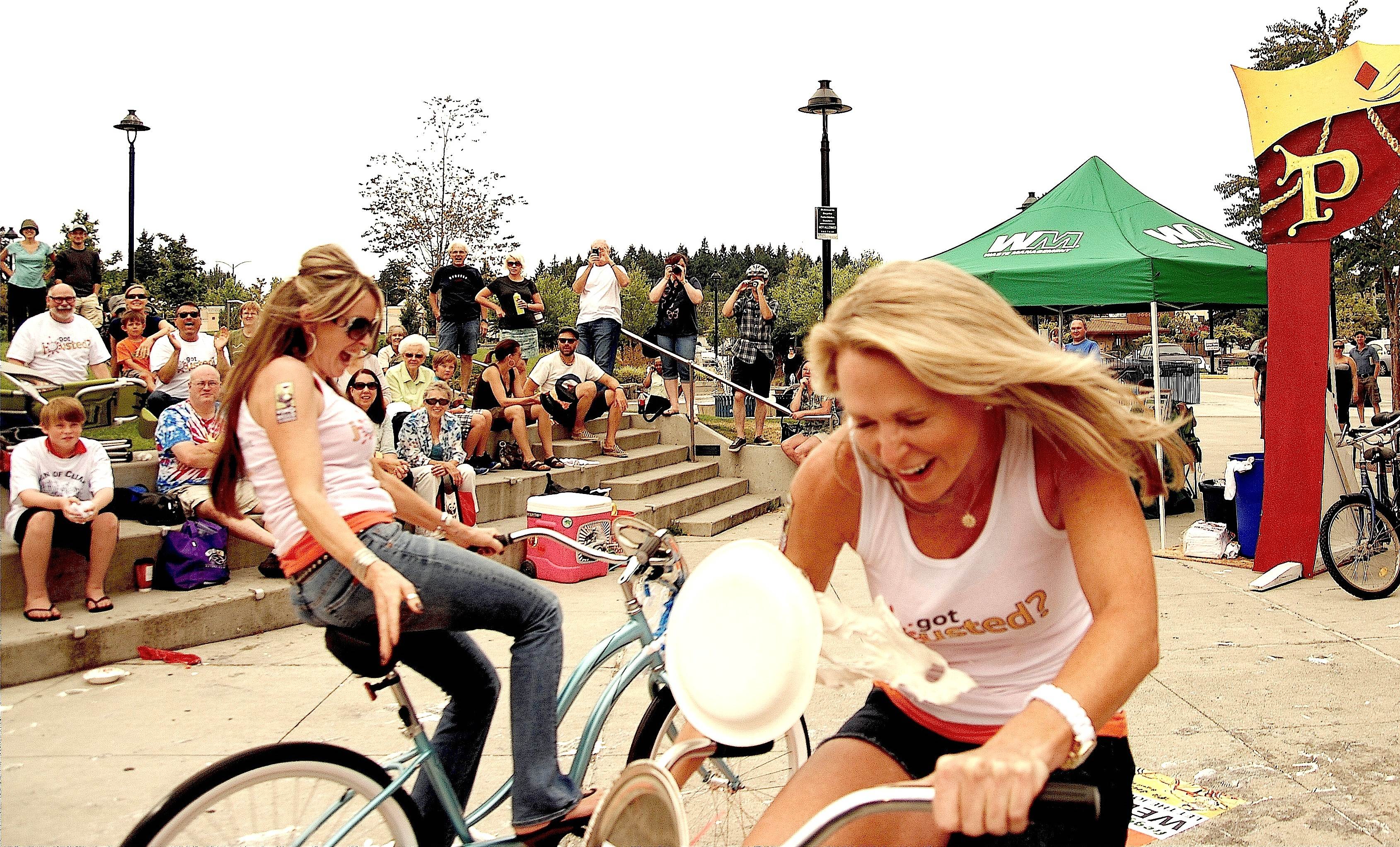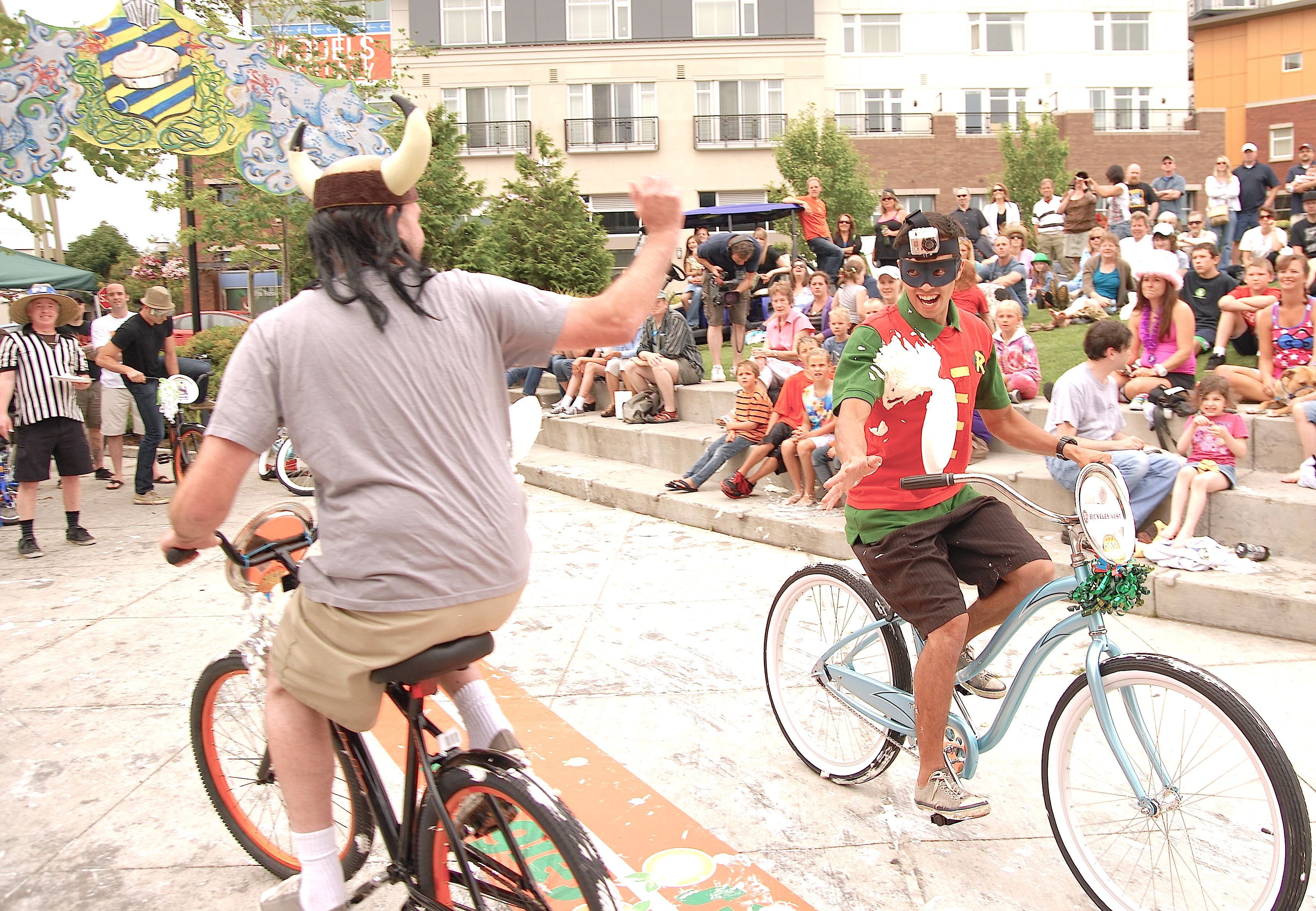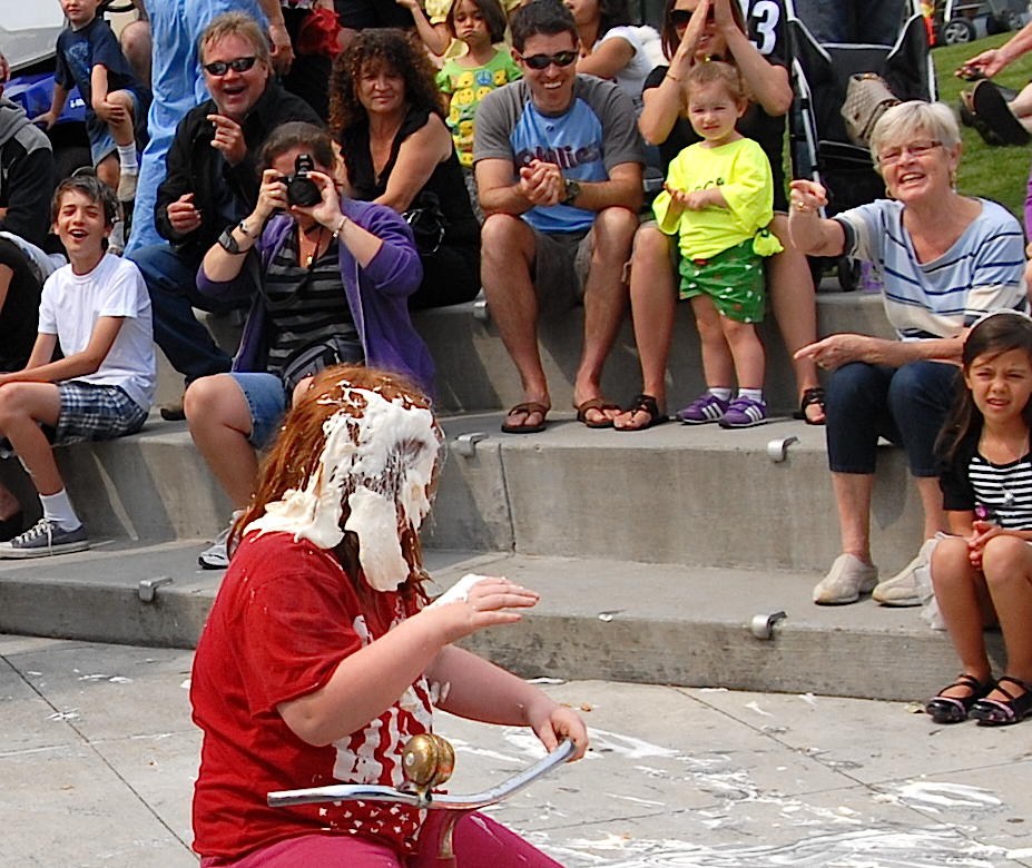 Burien Councilmember Jack Block, Jr. elevated the competition by climbing a tall ladder and getting pulverized by whipped cream-filled saucers Aug. 18 at Burien's 2nd Annual Pie Joust in Burien Town Square. Folks paid to have their kids attempt to plaster his face. While others jousted on bicycles, he challenged kids to reach his face with pies, and some succeeded. All in good fun as entry fees supported WABI (Walk/Bike), Cove To Clover, and Evergreen Mountain Bike Alliance organizations. Click on photo for SLIDESHOW.