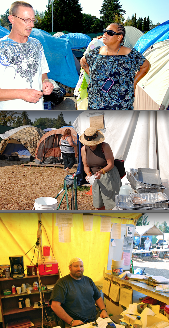 Tent City 3 is hosted by Riverton Park United Methodist Church, 3118 S 140th St., Tukwila until Nov. 17 when it will pull up stakes and move again to another host church. Pictured top are encampment residents Alan & Jennifer. Alan grew up in Tukwila. Pictured middle, a resident does her chores, bottom is ex-Marine Andy, in the office by the entrance. He said residents are the eyes and ears of the neighborhood and report all suspicious activity to police.