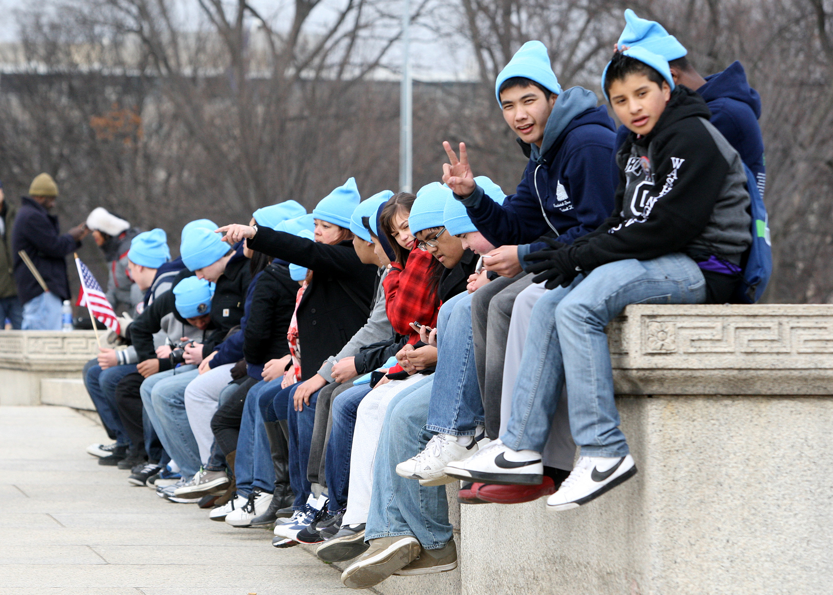 AT THE INAUGURATION. The Global Connections High School band (Also known as the Blue Hat Pack) poses at the National Mall before the Presidential Inauguration ceremonies. The Capitol building is in the distance. Our photographer was embedded with the group as they traveled to Washington D.C.