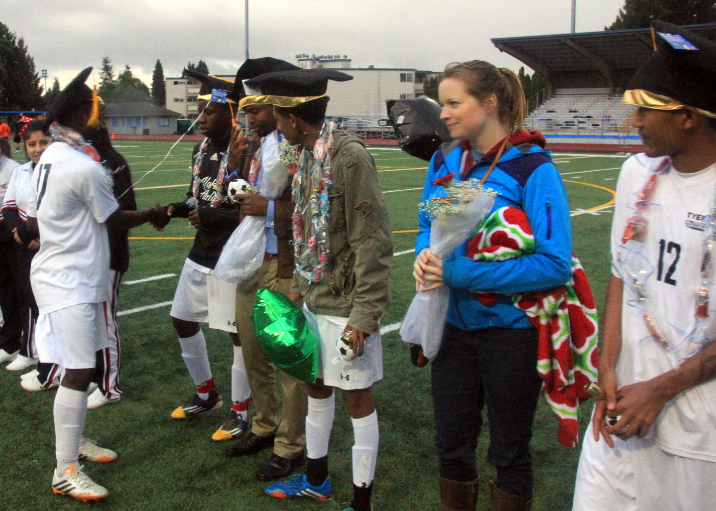 And, this was a good night no matter the loss, as, it was Seniors Night, for the Totems. And, the seniors were, each, individually, introduced, before the game, getting candy leis put around their necks, getting things, like, hats, put on their heads, having a cool processional, all and all. The seniors were all smiles throughout the proceedings, the joy seen on the faces of the six seniors getting honors, being Mohammed Dukuly, Muya Hamadi, Kinfu, Thang, Lopez, Kante and Navarro.