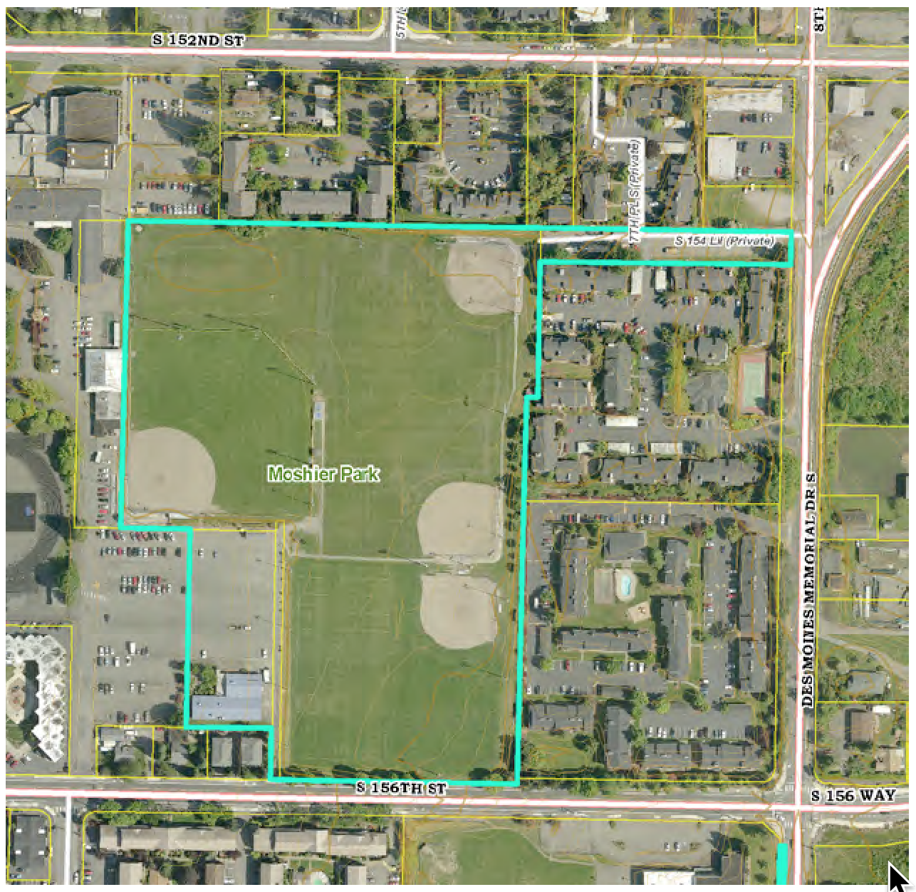 This 15.2-acre community park is located at 430 South 156th Street in central Burien adjacent to Highline High School in central Burien. The park shares parking with the Moshier Arts Center located on the southwest boundary.