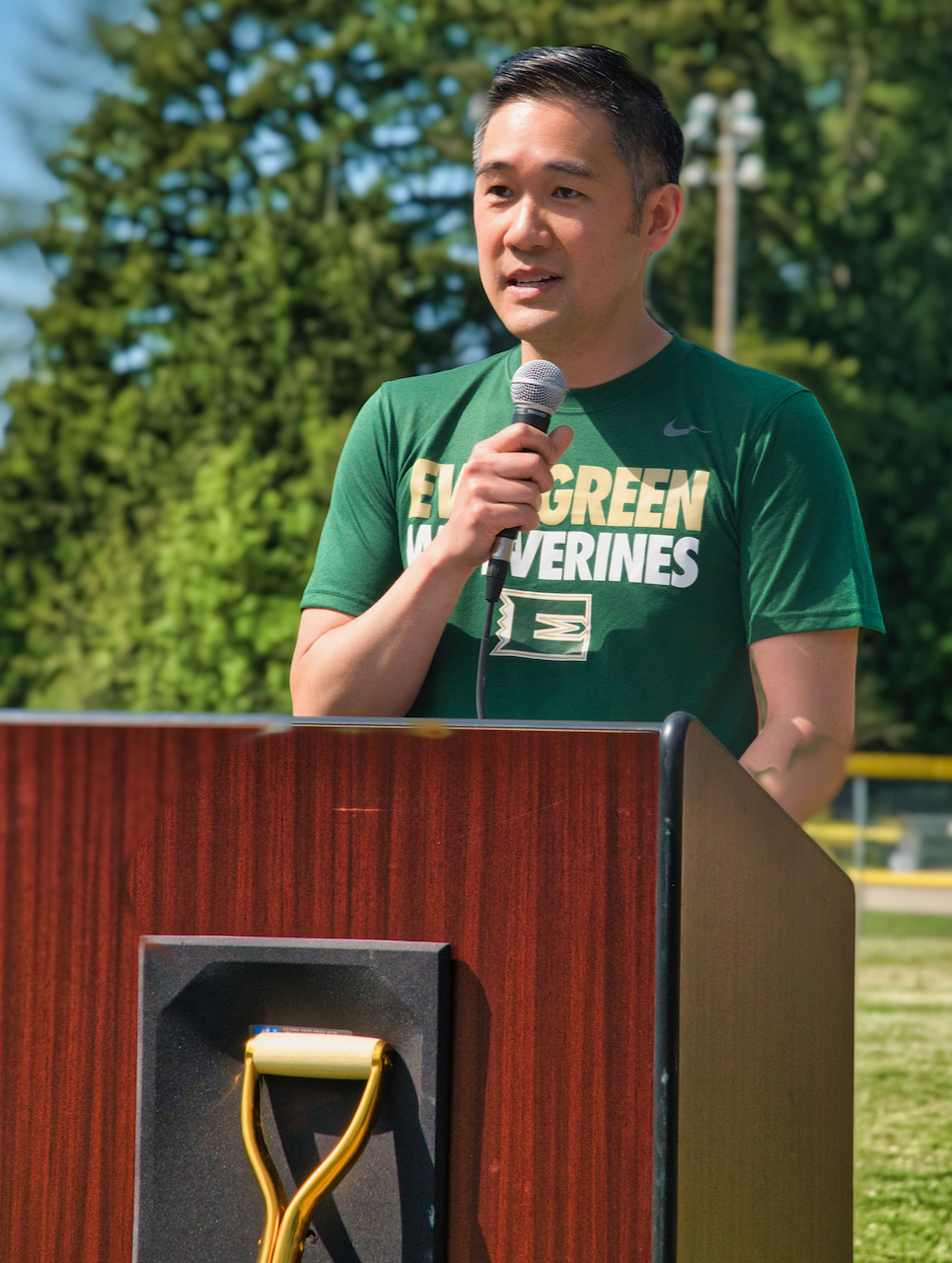 Evergreen Principal Simón Iñiguez spoke to the crowd. Photo by Patrick Robinson