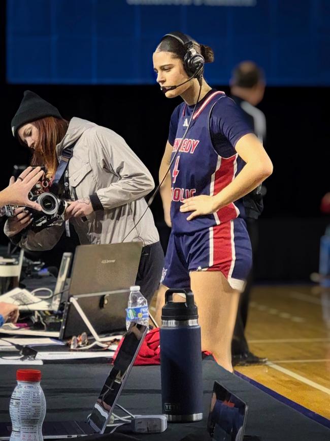 Jayden Fitzgerald (3) leaves the court after scoring 32 points and Gabriela King grants a radio interview.