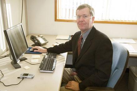 New Burien City Manager Mike Martin works in his office at the interim City Hall. Photo by Amber Trillo