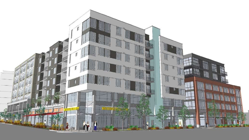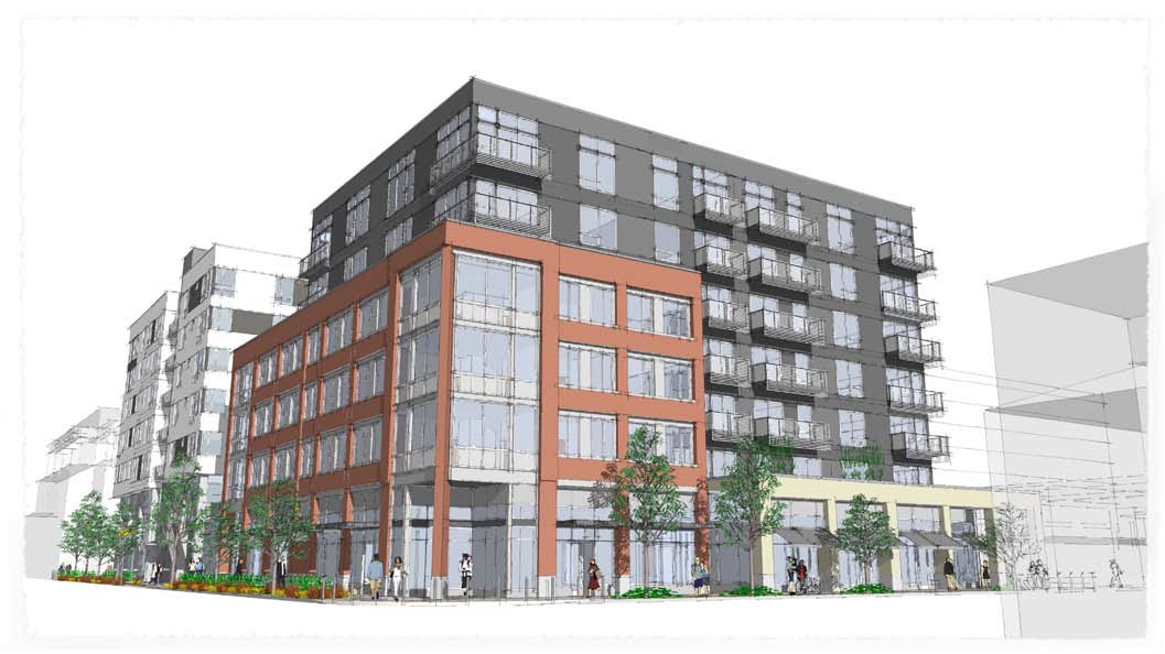 The proposal, being developed by Conner Homes, is for a seven-story building containing 12,745 square feet of commercial and 72 residential unit above. Three levels of below grade parking to be provided for 307 vehicles. Existing structures to be demolished.