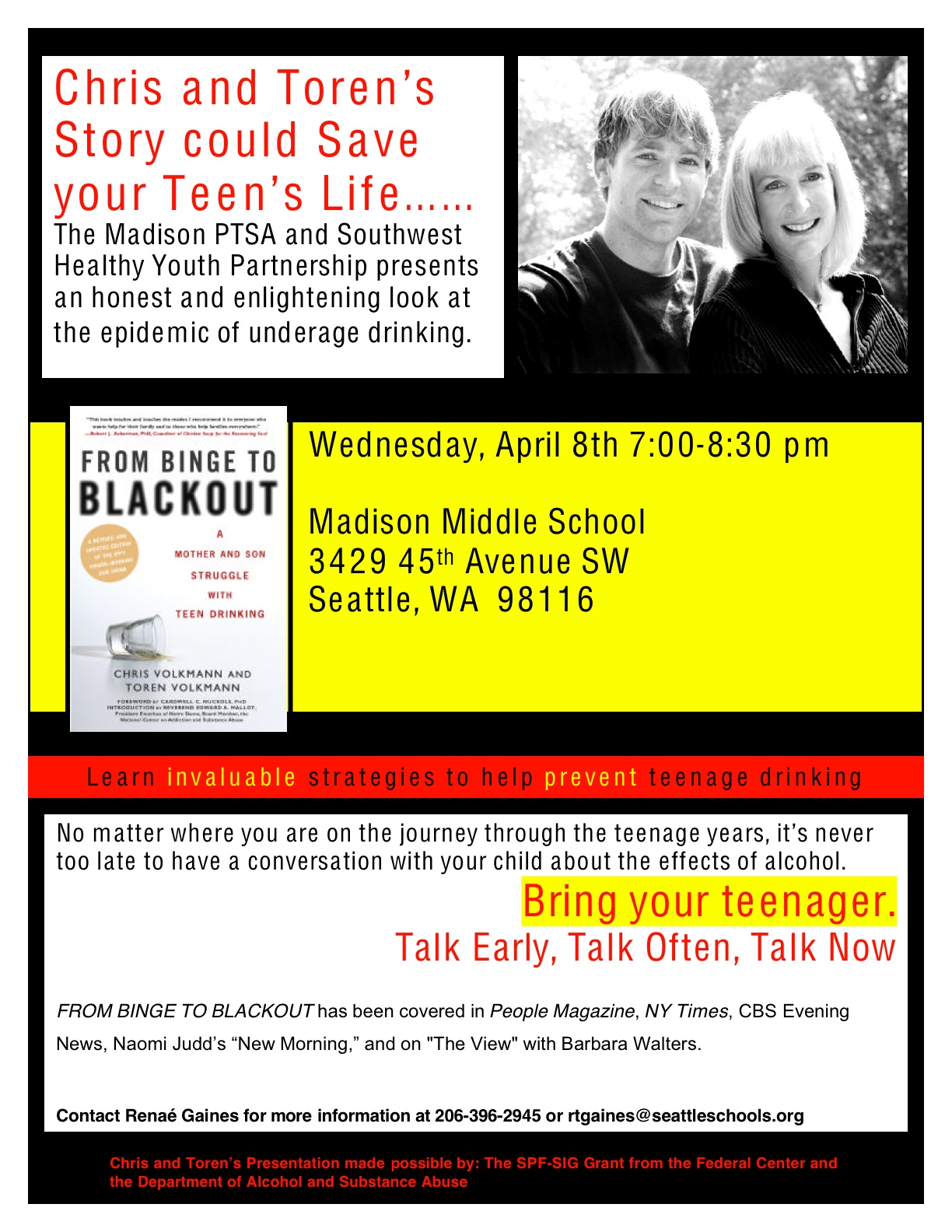 The event is sponsored by the Madison Middle School Parent Teacher Association and the Southwest Healthy Youth Partnership. It features special guests the author's of "From Binge to Blackout: A Mother and Son Struggle with Teen Drinking," Chris and Toren Volkmann.