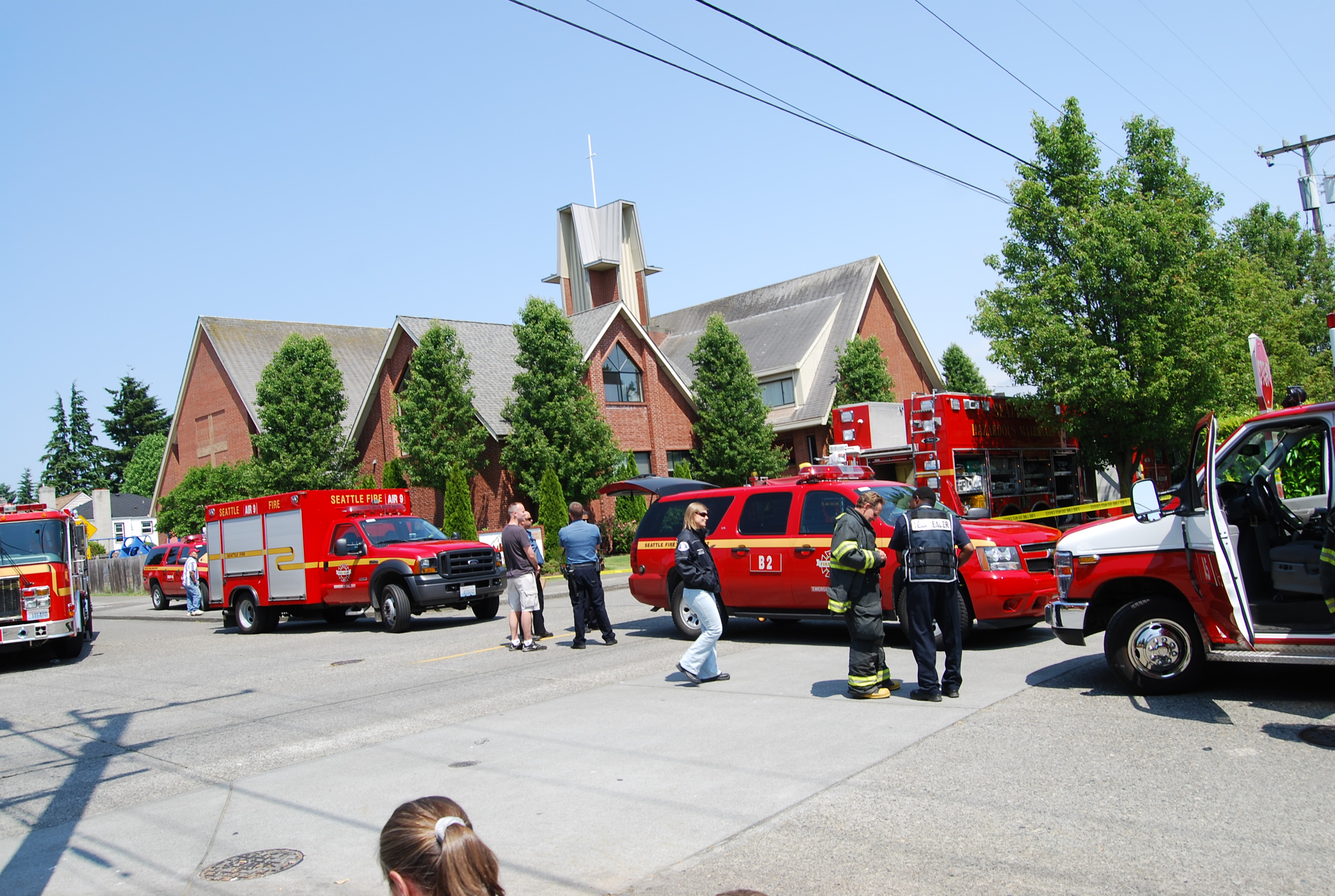 Fire trucks and emergency vehicles respond to a hazardous materials call near 80th Avenue Northwest and Northwest Mary Street.
