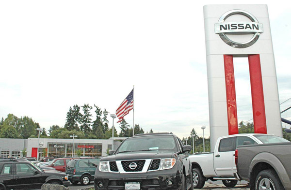 Vehicles are parked in the Burien Nissan lot, possibly awaiting a mid-month reopening of the dealership.