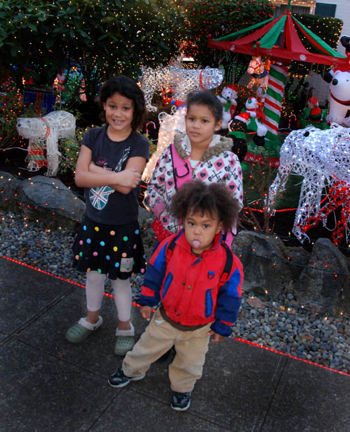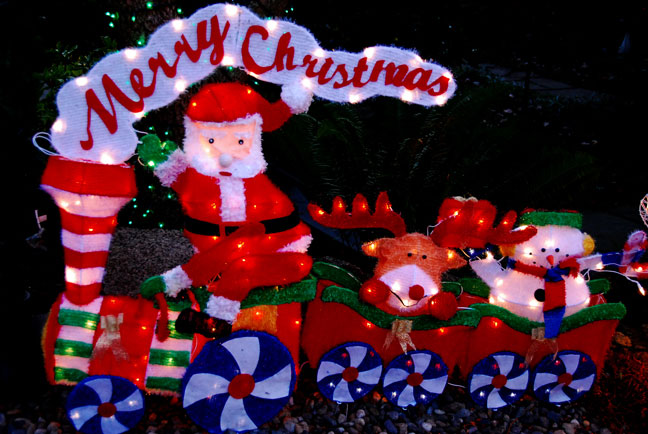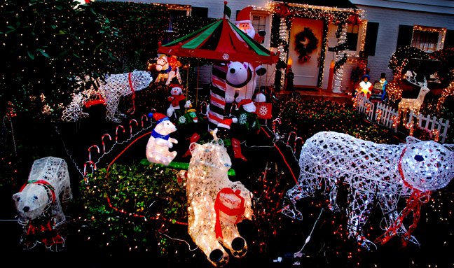 A cherry picker style crane was used to lift an inflatable christmas carousel decoration atop Jack Menashe's hedge near his house on Beach Drive.The Menashe family, owners of Menashe Jewelers in the junction have likely the largest display of christmas lights in West Seattle every year. During the process, people slowed and stopped to gawk at the elaborate work underway.