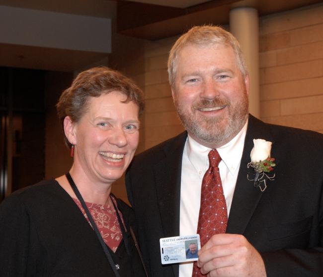 Mayor Mike McGinn shows off his Undriver License with Sustainable Ballard's Julia Field at a reception after taking his oath of office Jan. 4.