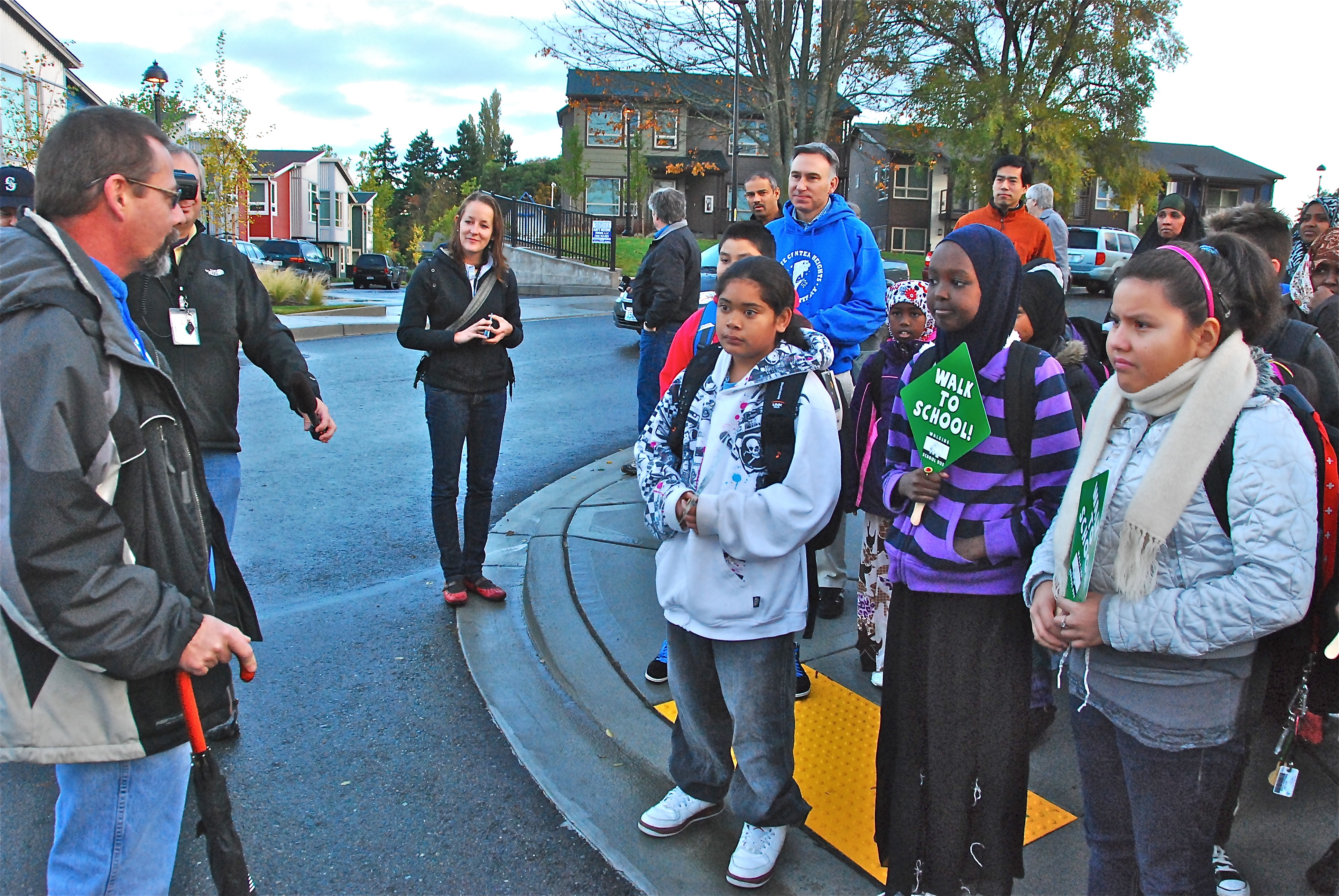 Constantine said, "Today we're celebrating our effort to make it easier for kids to walk to school by walking to White Center Heights Elementary. It's become harder and harder for kids to walk safely to school because of traffic and the way we've built our communities, so we're going to reverse that. We're going to make sure that we're building communities that make it possible for kids to get more exercise, to be healthier and to walk to school."
