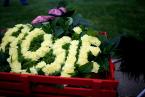 A group of a couple dozen Newfoundlands, escorted by their owners, carried flowers from Woodmont Elementary School in Des Moines to Lora Perry's home, where Rosie was shot.