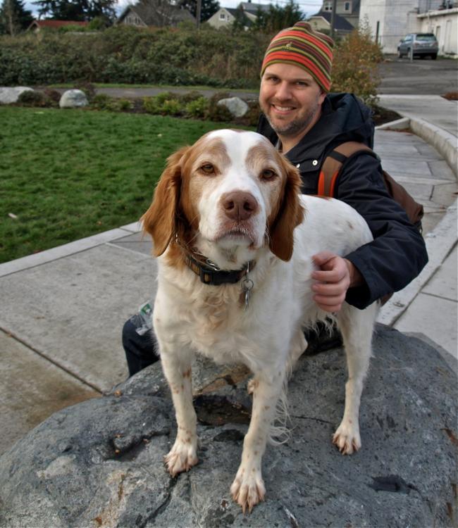 Zeke is a Brittany, a kind of spaniel and his owner Paul got him just over 7 years ago as rescue dog from a breeding kennel that was defunct. Zeke was on PetFinder in Whatcom County through the Alternative Humane Society of Whatcom County. "It was this breeding kennel that some guy had with Brittanys outside of Ferndale and I guess he abandoned it. His wife or girlfriend called AHS and told them she couldn't handle the dogs. They were all chained up outside, in December on separate posts. They couldn't touch each other and they had a little plastic barrel to get inside."