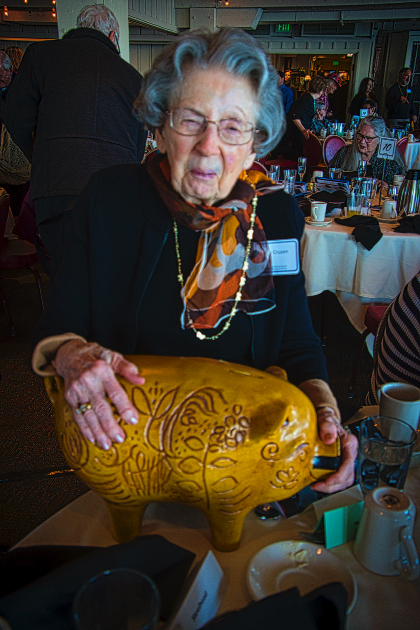 Husky Deli owner Jack Miller donated a "Make Your Own Ice Cream Flavor" auction item. Photo by Patrick Robinson Matt Vaughan thanks Chris Richardson for his $5000 bid on a rare Eddie Vedder show poster. Photo by Patrick Robinson. Seattle radio personality John Maynard. Photo by Patrick Robinson. Peder Nelson, music curator at the SWSHS Log House Museum. Photo by Patrick Robinson. Local philanthropist Adah Cruzen with her "piggy bank" she uses to collect donations for the causes she supports. Photo by Patrick Robinson