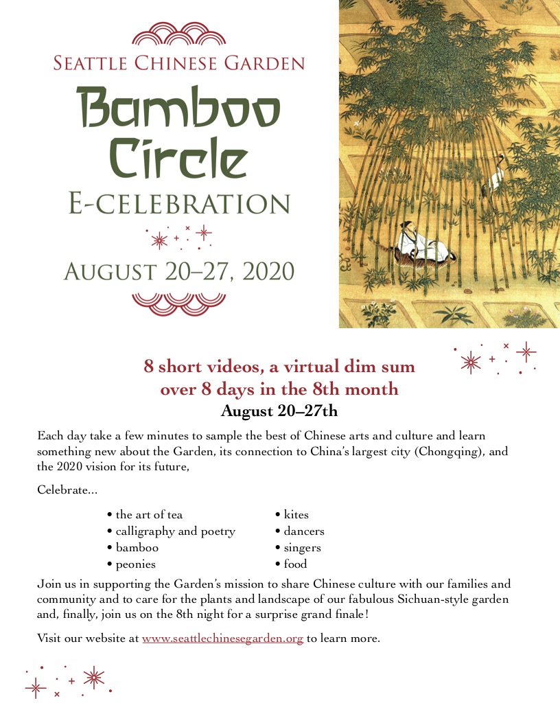 The Seattle Chinese Garden is holding a very special Bamboo Circle E-Celebration the week of Aug. 20 through 27 featuring 8 short videos, a virtual dim sum over 8 days in the 8th month