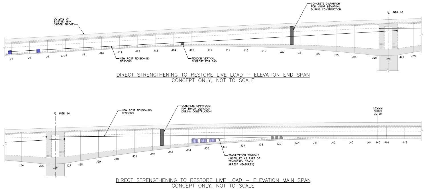 "The direct strengthening to restore live load (rehabilitation) concept consists of post-tensioning inside all spans of the box girders. The strengthening would restore capacity to the distressed regions so that live load could be restored to original condition for the bridge’s remaining service life (40 additional years).