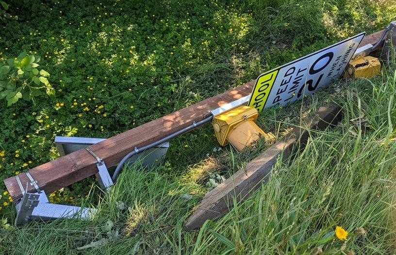 This traffic speed reminder sign was destroyed. Photo by Greg McCorkle