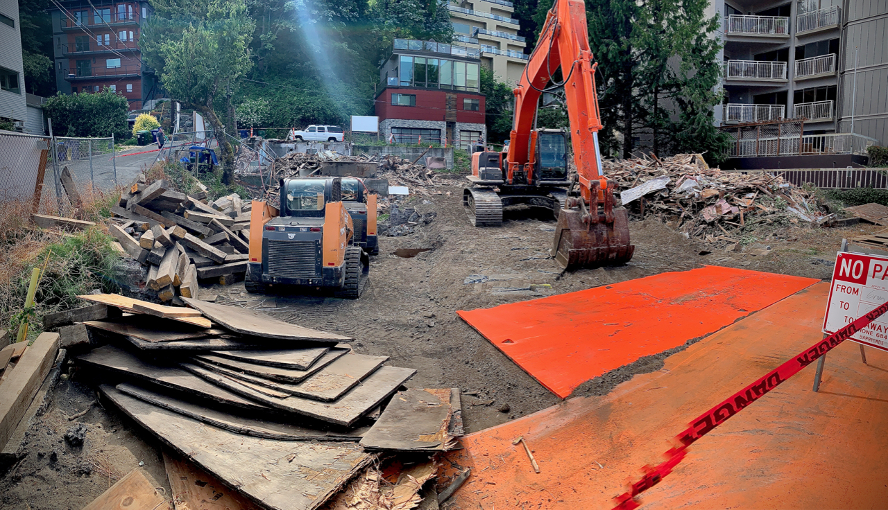 Construction crews wasted no time tearing down an adjacent structure after the move. Photo by Patrick Robinson Replacing the stone cottage and pink house is a 6-story, 18-unit apartment building. Parking for 27 vehicles proposed. Photo by Patrick Robinson