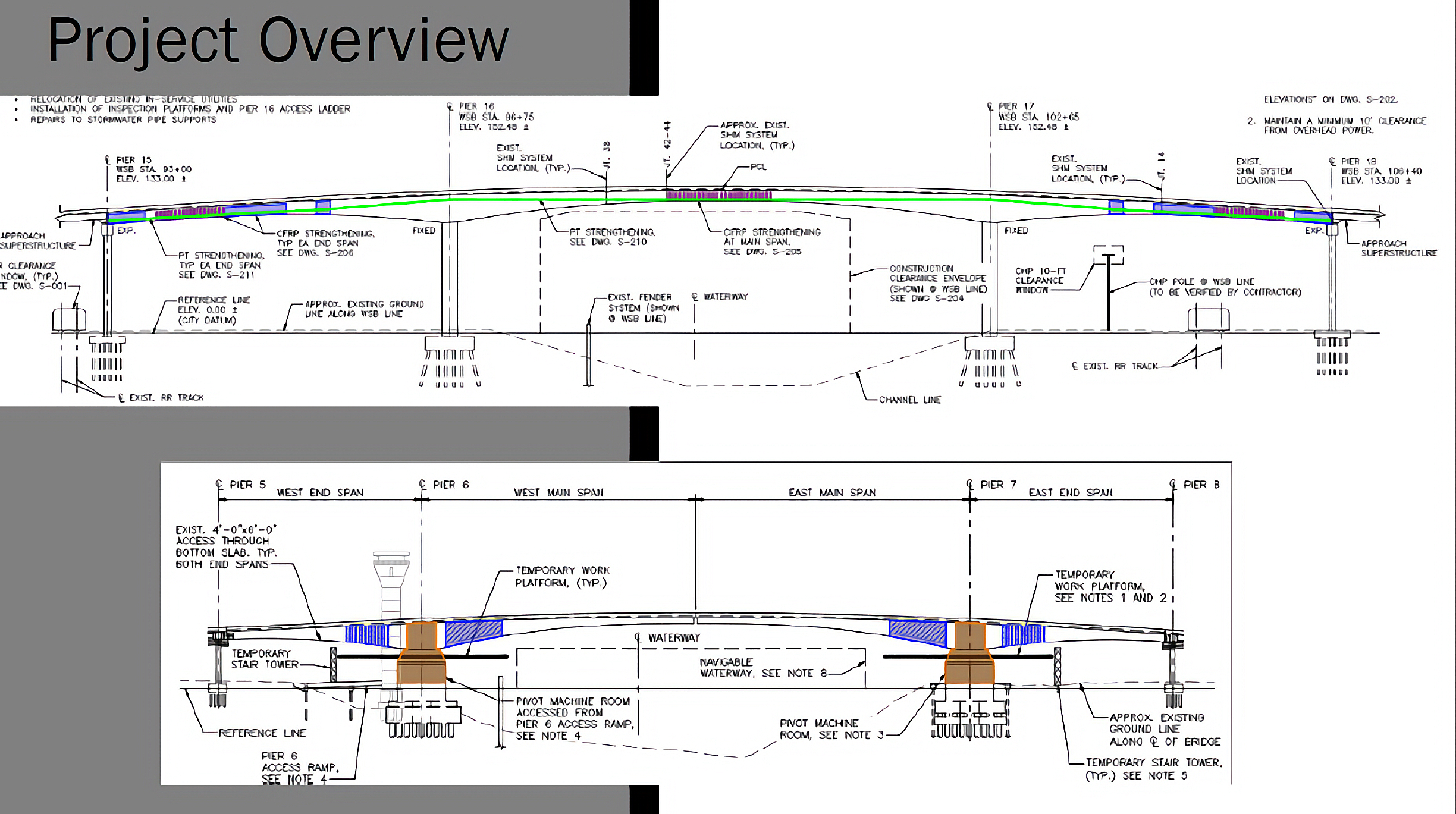 This slide shows where repairs will take place. In case it’s not visible on your device, here’s a link to a larger visual for this and the next slide. In the drawings, “PT” means steel post-tensioning (shown in the green line), and “CFRP strengthening” means carbon fiber polymer wrap strengthening (shown in blue for exterior work, and purple for additions inside the bridge).
