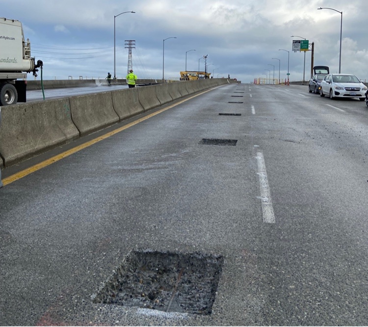 Hydro-demo holes in the bridge deck surface, which crews are using to attach rigging cables to hang work platforms.