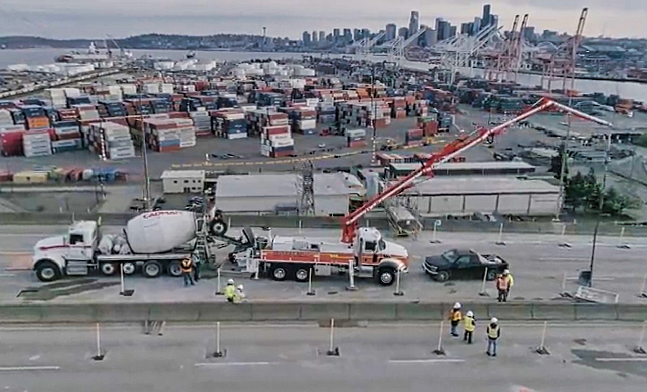 Crews from Cadman cement and the Seattle Department of Transportation were atop the West Seattle Bridge on Saturday April 16 to begin the first of the final specialized concrete pours to complete repairs on the bridge. Closed since March of 2020, the bridge is expected to reopen this summer.