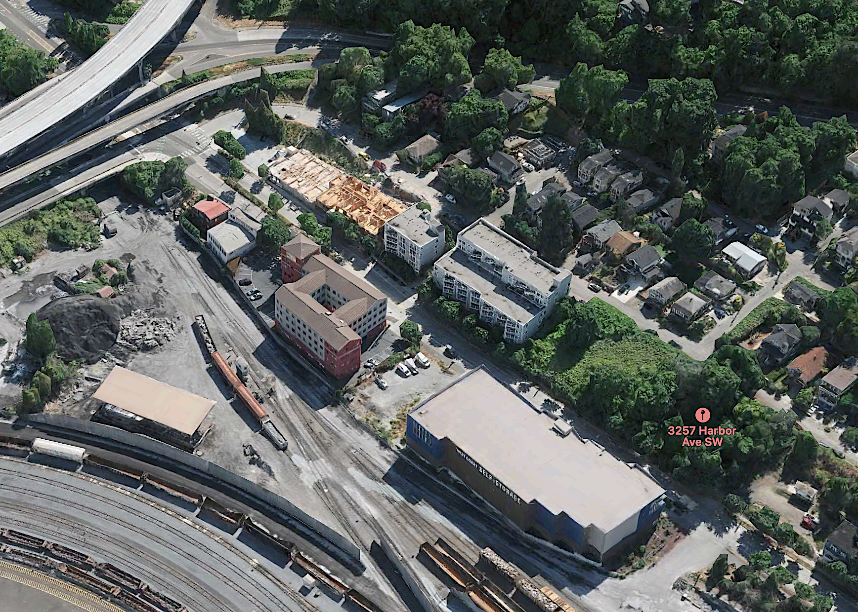 The land at 3257 Harbor Ave SW at lower right is proposed as the site of a 308 unit apartment building.