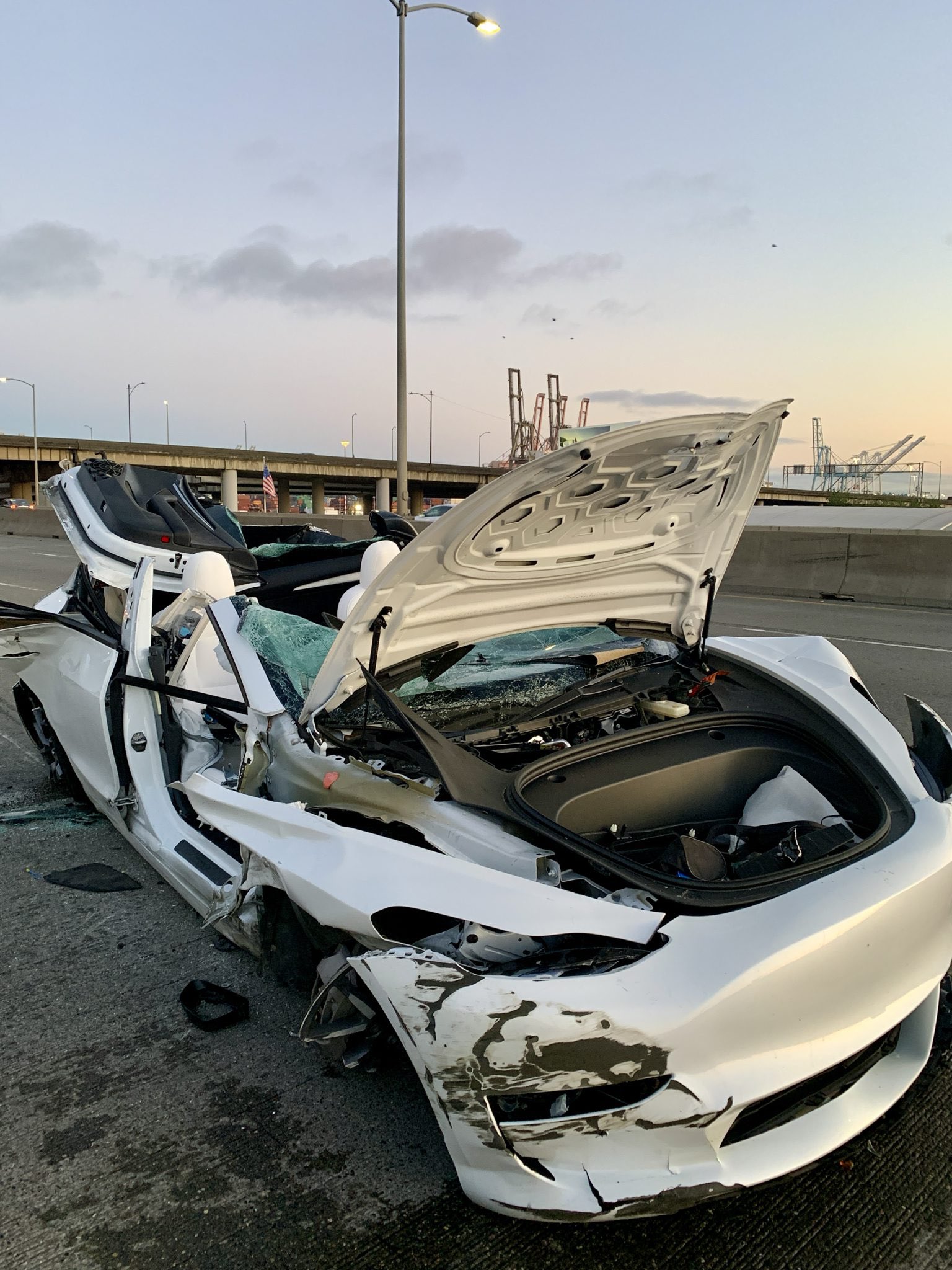 The remains of the Tesla that was involved in the incident on the West Seattle Bridge Friday morning July 19.