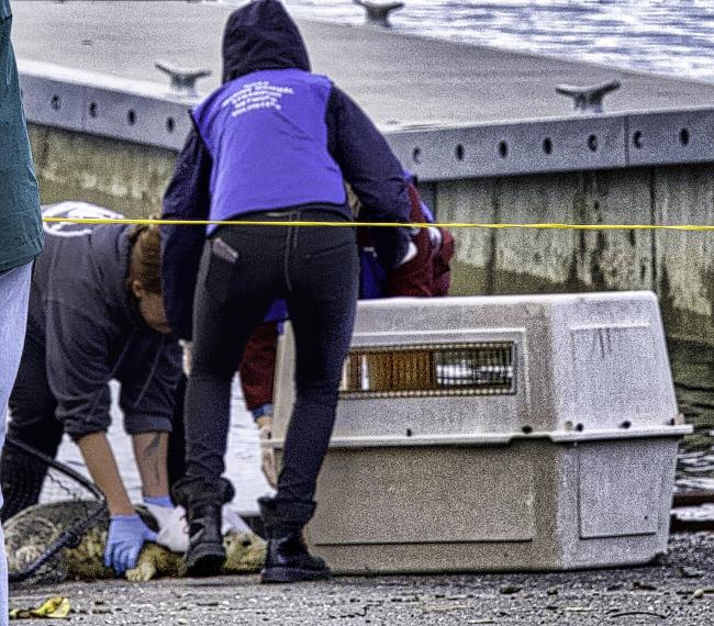 Members of Seal Sitters and the NOAA Marine Mammal Stranding Network gently collected a young Harbor Seal at the Don Armeni Boat Launch on Sunday.