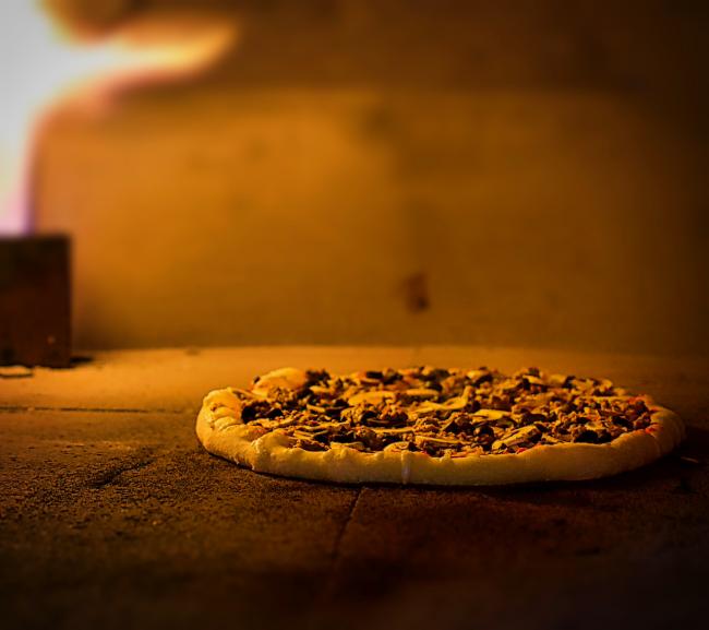 The new location offers both indoor and outdoor seating. The interior features a small dining space with five tables. The showpiece is the covered outdoor courtyard, which is where the wood-fired pizza oven is located. The oven, which took about two months to build, was constructed by the "very talented masonry duo" Johnny and Kevin of Lafayette Masonry.