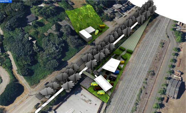 The proposal envisions a central covered corridor flanked by food trucks, seating areas, and temporary restrooms. Organizers say the project responds to community demand for more flexible, informal spaces where residents can gather, eat, and shop.