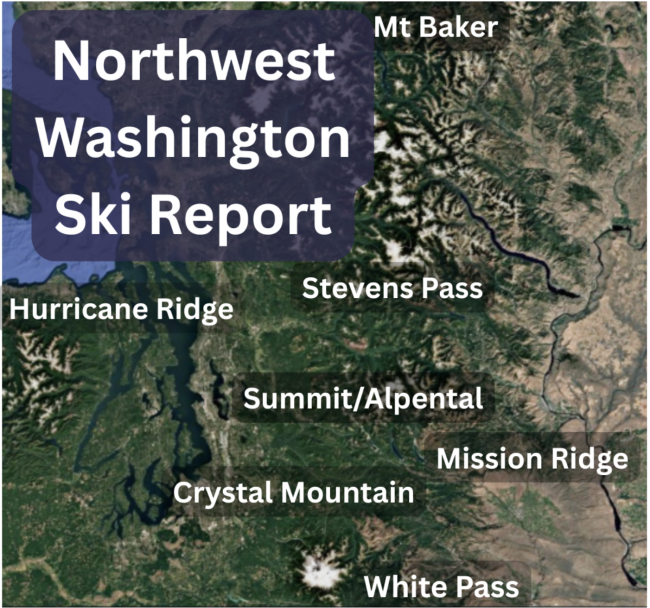 Mt Baker Ski Area received a lot of snow- 15 inches at Heather Meadows, allowing for a nice refresh. Warm temps and some rain have softened up the snow, leading to fun, spring-like conditions. Unfortunately, Mt Baker had to cancel this year’s Legendary Banked Slalom due to snow conditions in the natural half pipe. Fingers crossed for next year! All lifts are running, and expect wet conditions!