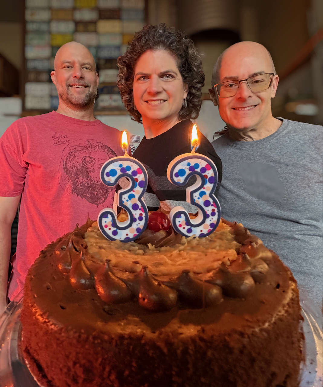 Sean Welch, Shannon Felix and Jon Felix celebrated the 33rd anniversary of Avalon Glassworks, West Seattle's art glass store.